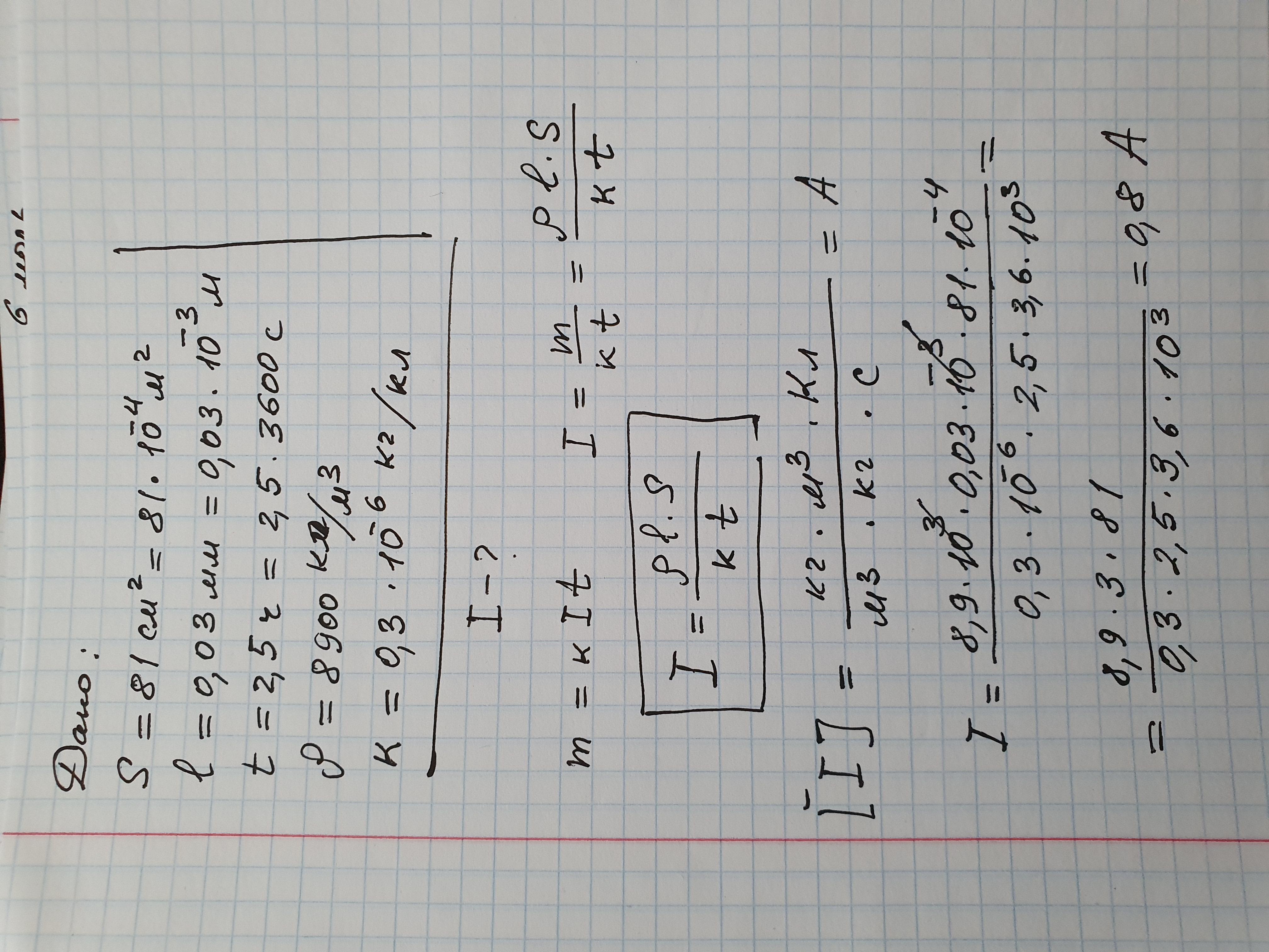 Унаслідок нікелювання пластини площею 81 см2 поверхня якої вкривається шаром нікелю завтовшки 0,03 мм. Визначте значення струму, якщо нікелювання триває 2,5 год. Густина нікелю 8900 кг/м3, електрохімічний еквівалент нікелю 0,3 мг/Кл.