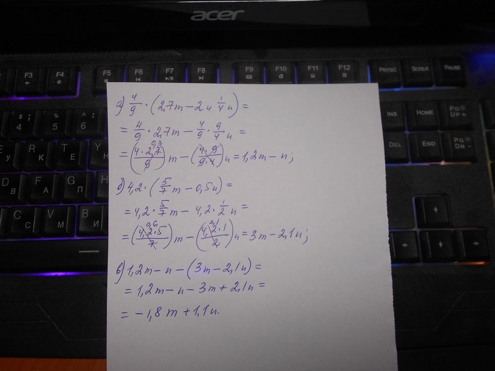 4/9 * (2,7m - 2 и 1/4n) - 4,2 * (5/7 m - 0,5n) = = -1,8m + 1,1n.