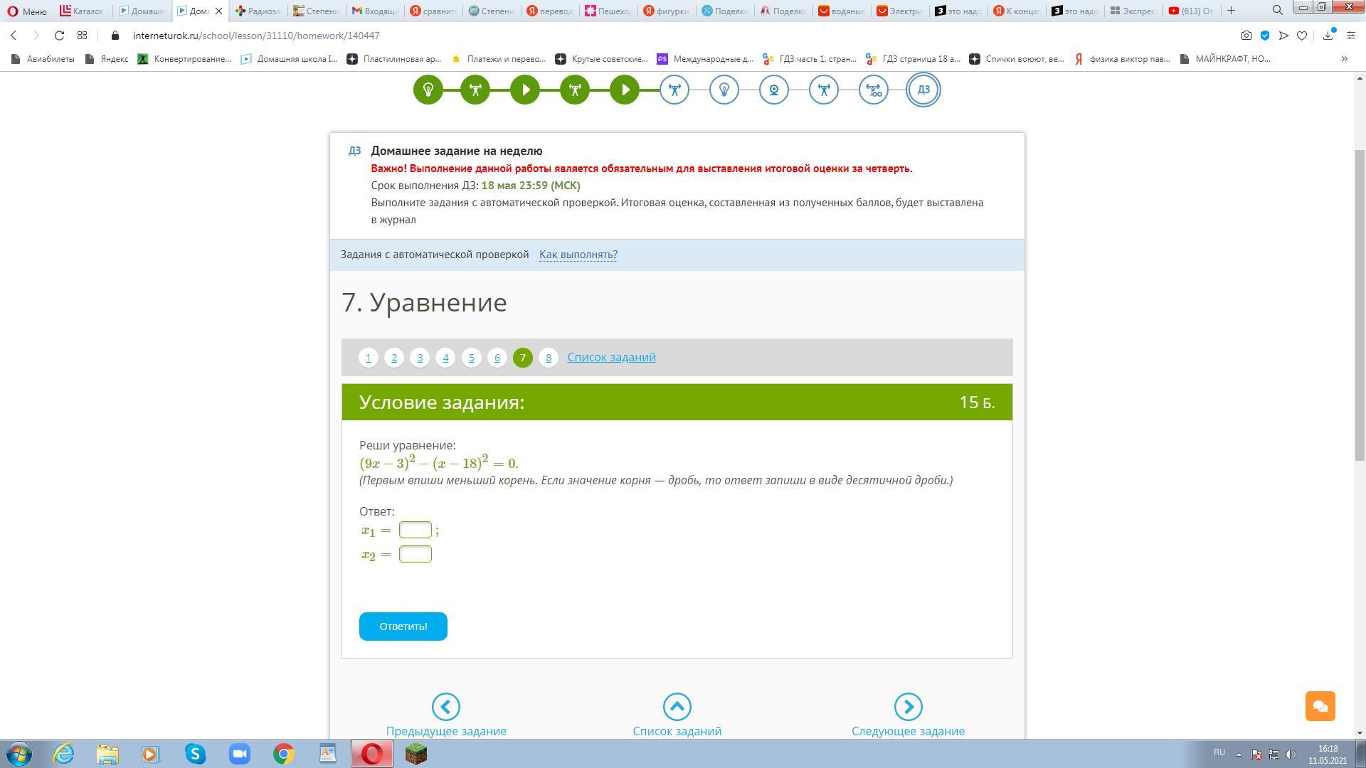 2-ой случай (выражения, возведенные в квадрат, равны по модулю, но противоположны по знаку): 9x-3 = -(x-18)