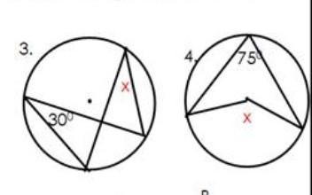 4) Вписанный угол равен 75°. Он равен половине центрального угла, опирающегося на одну и ту же дугу. Следовательно х=2*75=150°.