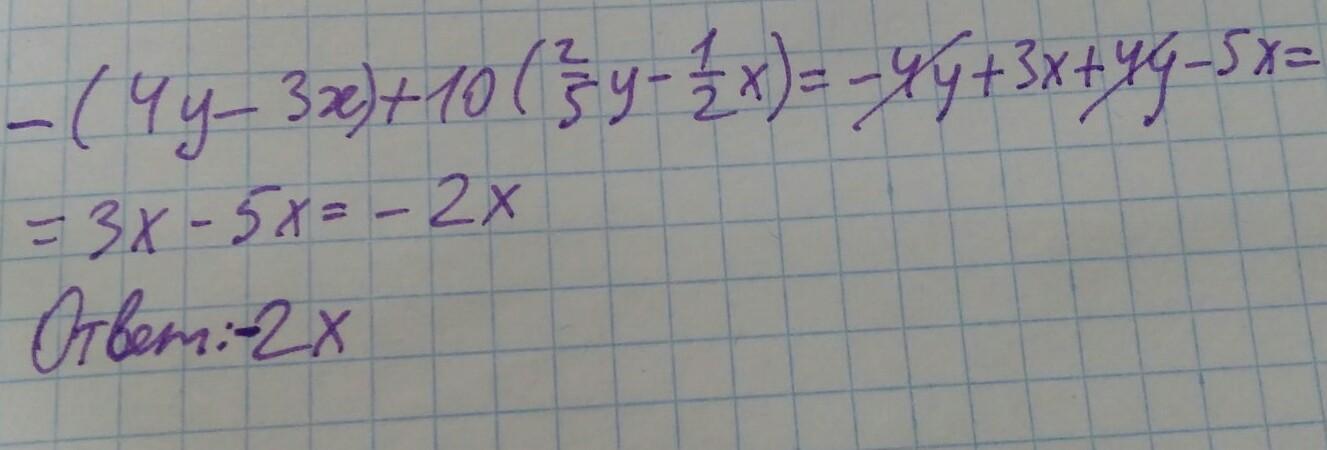 -(4у-3x)+10(2/5y-1/2x)= -4y+3x+20/5y-10/2x= -4y+3x+4y-5x = -2x (так как -4у и +4у сокращаются)