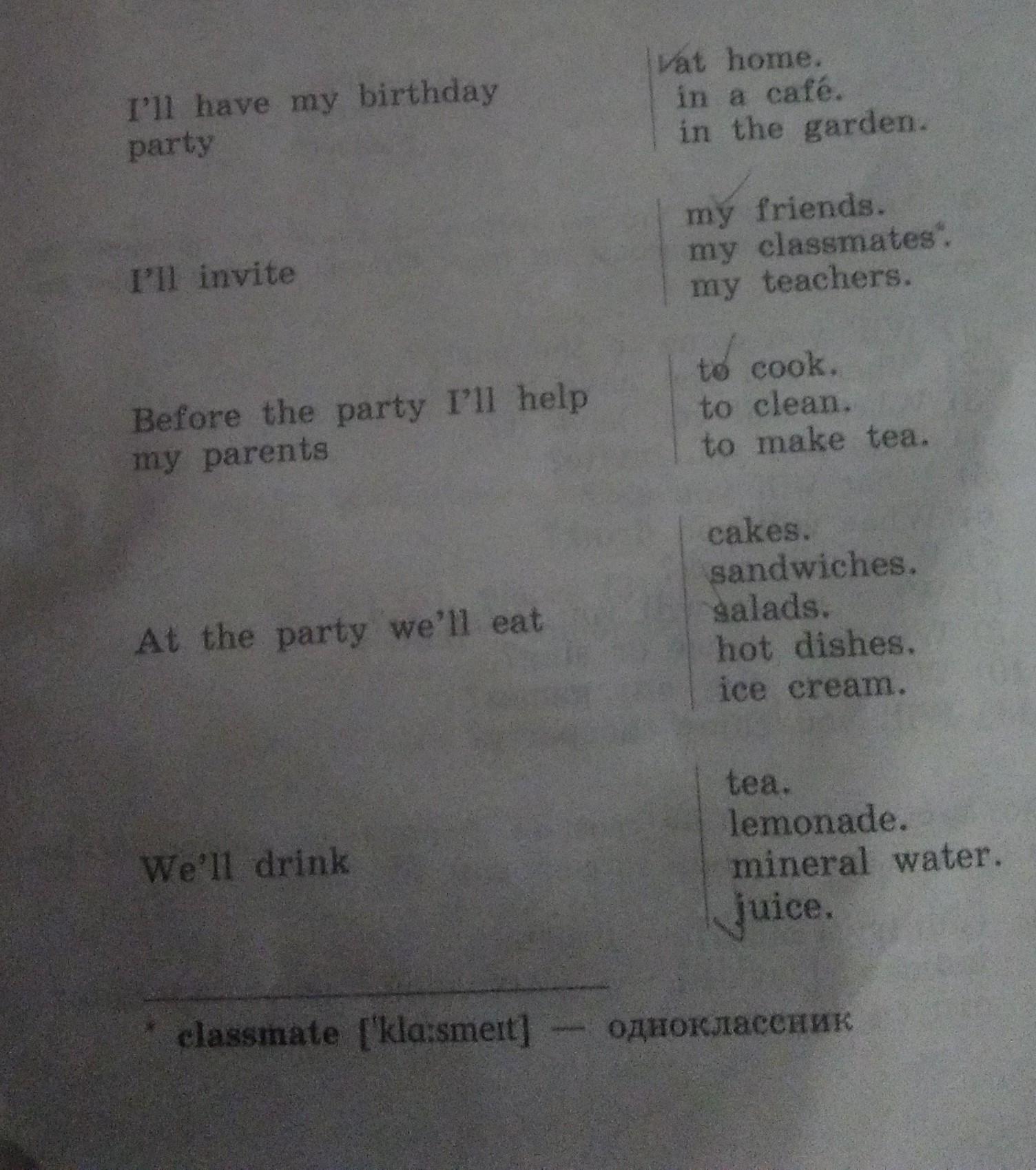 4)на вечеринке мы будем есть(торты, сэндвичи,салаты,горячие блюда, мороженое)