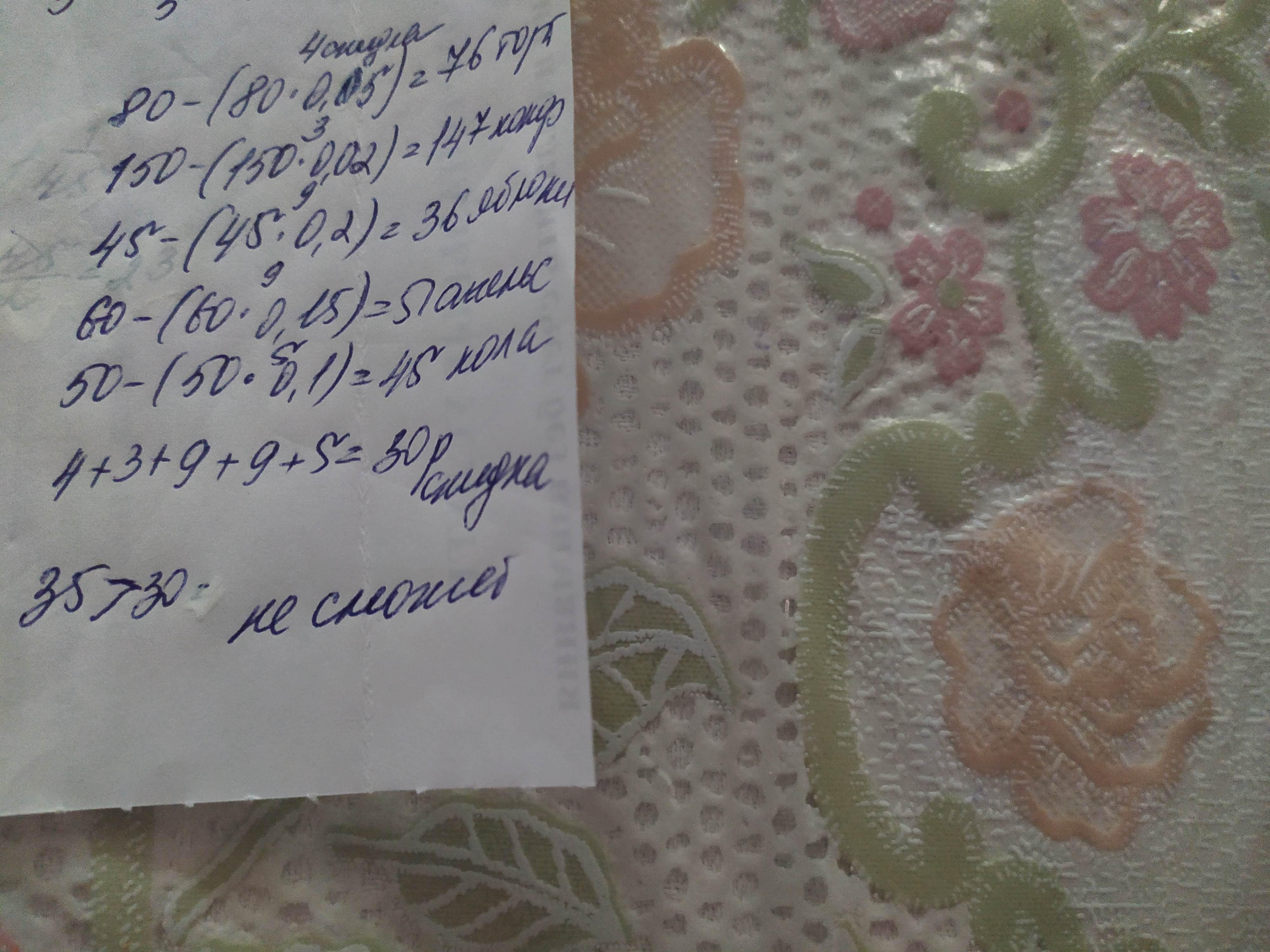 1. Незнайка был дежурным по кухне, и его отправили в магазин за покупками, выделив ему 80 сантиков для покупки торта, 150 сантиков - на конфеты, 45 сантиков - на яблоки, 60 сантиков - на апельсины, 50 сантиков – на бутылку «Пупсик-колы». Незнайке повезло: в этот день шла распродажа по сниженным ценам. Цены на торты были снижены на 5%, на конфеты – на 2%, на яблоки – на 20%, на апельсины – на 15%, и на «Пупсик-колу» - на 10%. Сможет ли Незнайка на сэкономленные деньги купить себе мороженое за 35 сантиков?