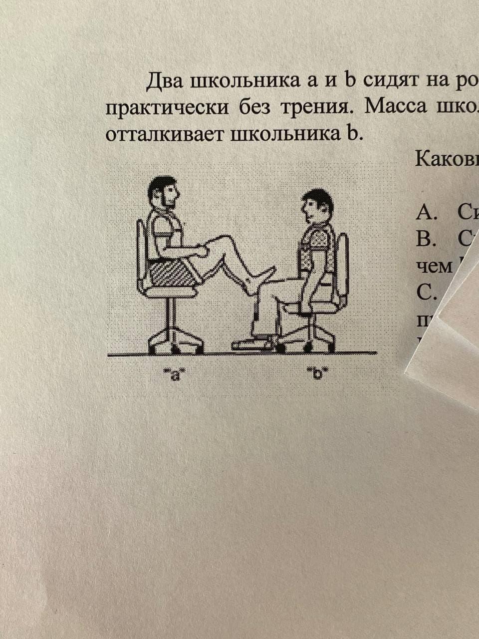 Два школьника a и b сидят на роликовых стульях (см. рис.), которые могут двигаться практически без трения. Масса школьника a больше массы школьника b . Школьник a отталкивает школьника b.