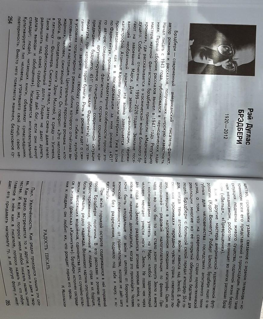 Брэдбери-американский современный писатель, автор известных романов и рассказов. Начал писать в 1943 году, но первый сборник рассказов вышел лишь в 1947. Репутацию писателя-фантаста ему принесли "Марсианские хроники". Второе его известное произведение это "451° по Фаренгейту". В его произведениях проявляются авторские особенности написания прозы: соединение фантастики с современными проблемами общества. Брэдбери очень умело и с большим воодушевлением передал атмосферу 50-х годов, когда мрачная тень атомной войны нависла над Землёй. Несмотря на всю остроту и гореч правды в прозе Брэдбери, она очень поэтична. В его произведениях раскрывается не только правда жизни, но и чувства, надежда и сострадание