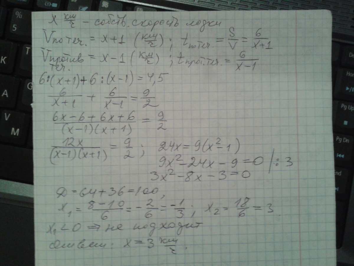 Моторная лодка против течения реки прошла 6 км и вернулась обратно. На весь путь она затратила 4 часа 30 минут. Скорость течения реки 1 км/ч. Найдите собственную скорость лодки.