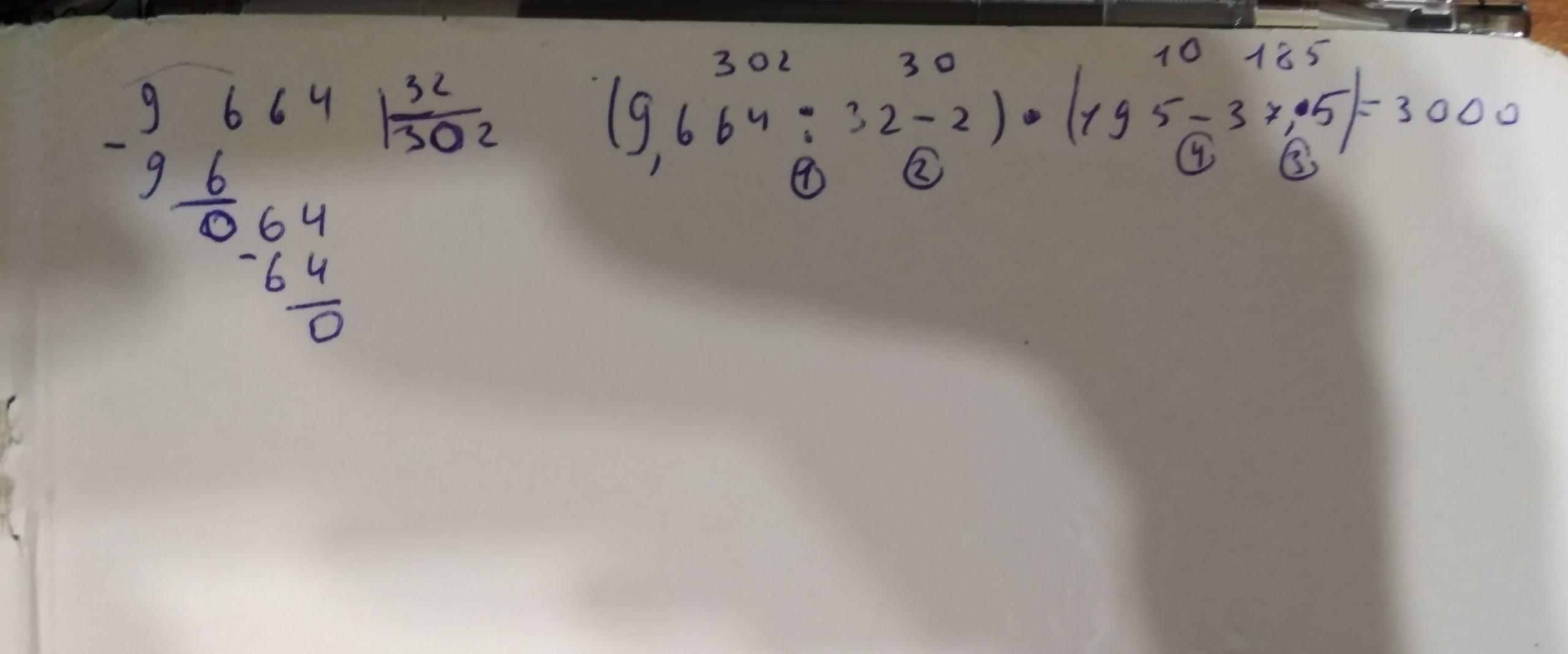 1 действие 9664:32= 302 ( Начинаем деление, у нас есть 96 и 32, мы можем получить 96 взяв 3 раза 32, вписываем 3 под 32, вычитаем 96 из 96 и получаем 0, дальше идет 6, 6 меньше 32, следовательно ставим ноль под 32 и идем дальше, после 6 идет 4, выходит у нас 64, 64 это два раза по 32, значит вписываем 2 под 32. Вычитаем 32 из 32 и получаем ноль, деление закончили)