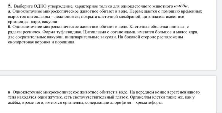 Ответ: а. Утверждение, которое только характерно для одноклеточного животного - амёба.
