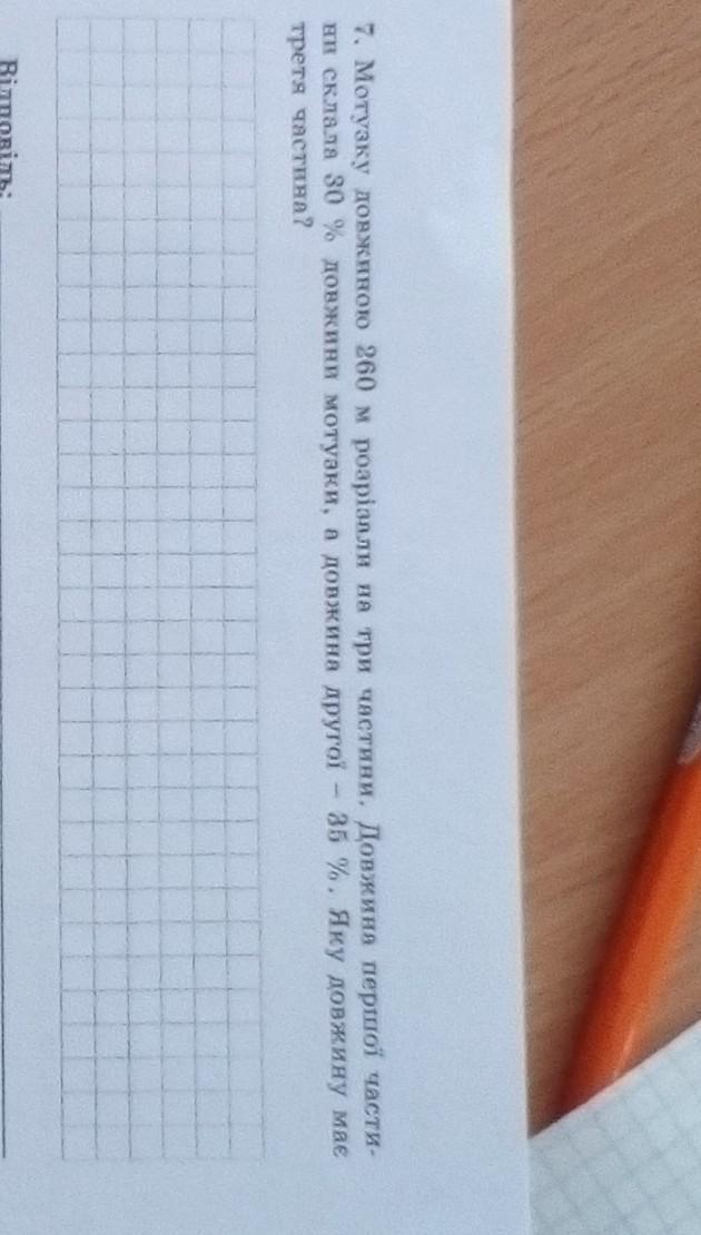 мотузку довжиною 260 м розрізали на 3 частини довжина першої частини складала 30 процентів довжини мотузки а довжина другої 35 процентів яку довжину має 3 частина