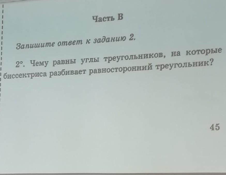 все углы равностороннего треугольника 60 градусов. биссектриса делит его пополам получается 30 60 и 90 градусов.