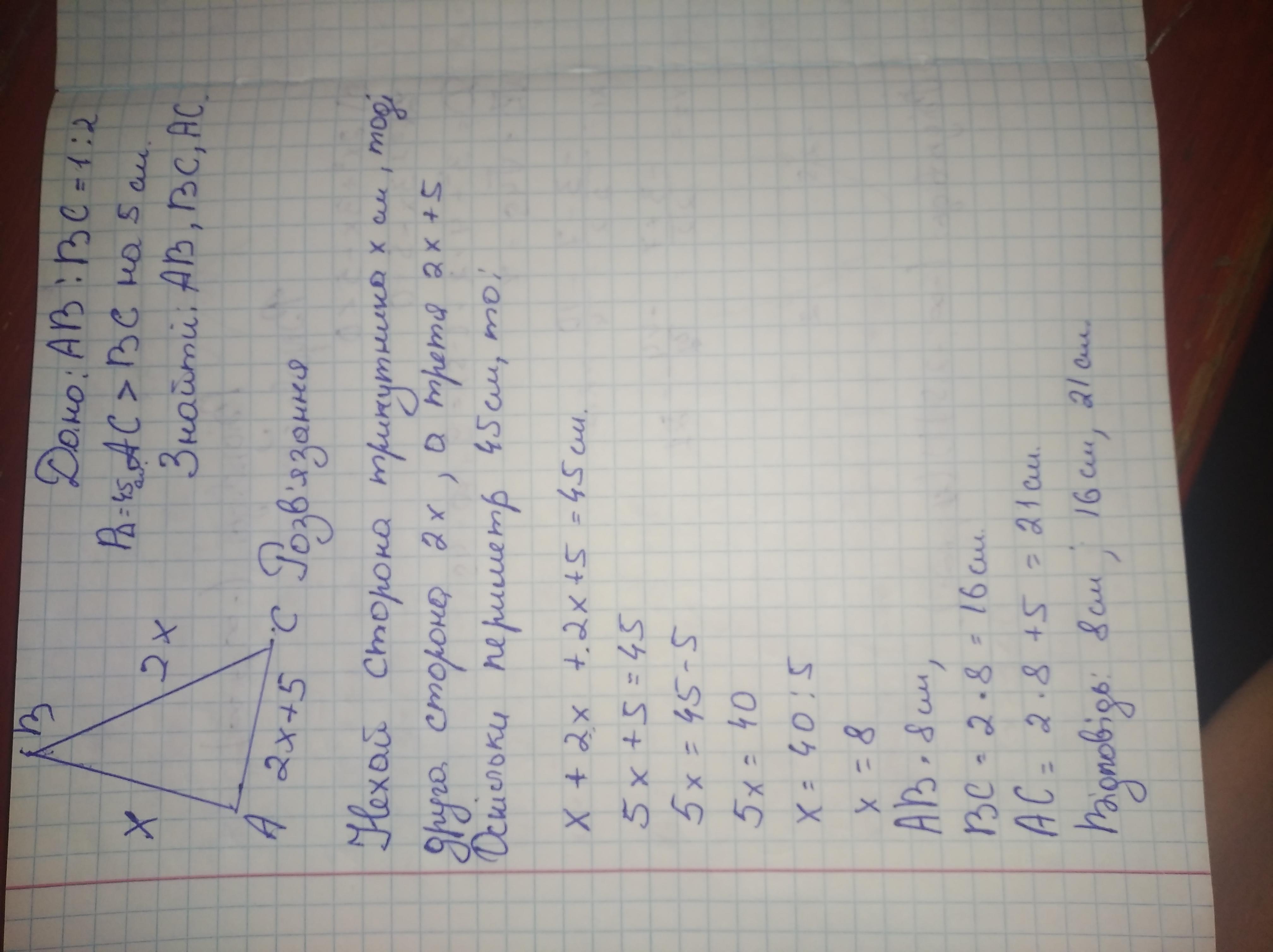 Одна сторона треугольника в два раза больше другой а третья на 5 см больше творог вычислите длины сторон треугольника если ага периметр равен 45 см
