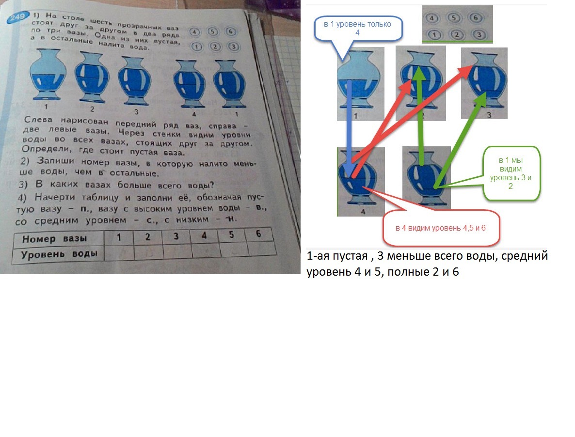 4) Начерти такую таблицу и заполни её, обозначая пустые вазы - п., вазы с высоким уровнем воды - в., со средним уровнем - с., с низким - н.