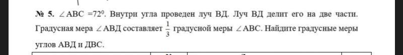 АBС=720 внутри угла проведен луч ВД. Луч ВД делит его на две части . Градусная мера АВД составляет 1/3 градусной меры , АВС . Найдите градусные меры угол АВС И АВД.