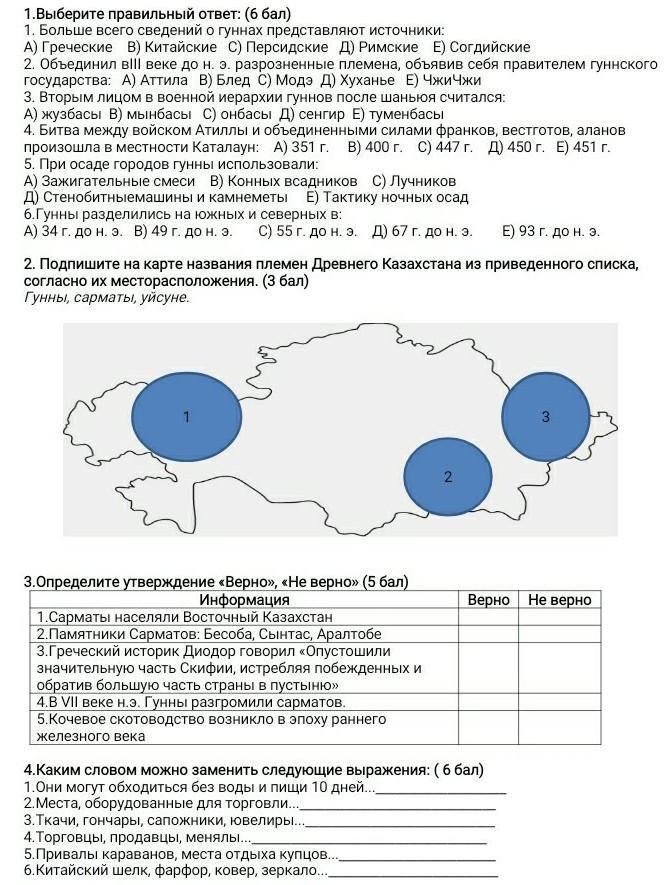 2. Подпишите на карте названия племен Древнего Казахстана из приведенного списка, согласно их месторасположения. (3 бал)