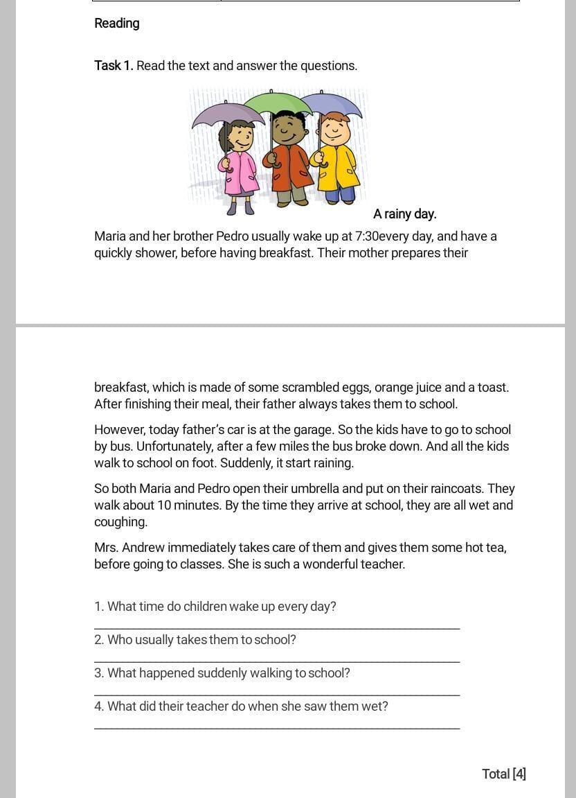 3. The bus broke down and when kids go to school on foot, it start raining.