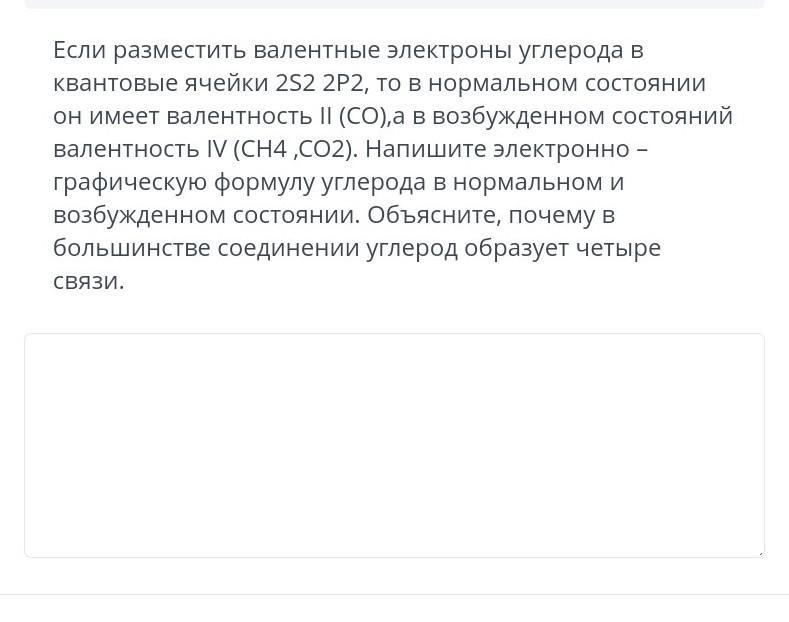Если разместить валентные электроны углерода в квантовые ячейки 2S2 2P2, то в нормальном состоянии он имеет валентность ll (CO), а в возбуждённом состояний валентности lV (CH4, CO2 ). Напишите электронно графическую формулу углерода в нормальном и возбуждённом состоянии. Объясните, почему в большинстве соединении углерод образует четыре связи.
