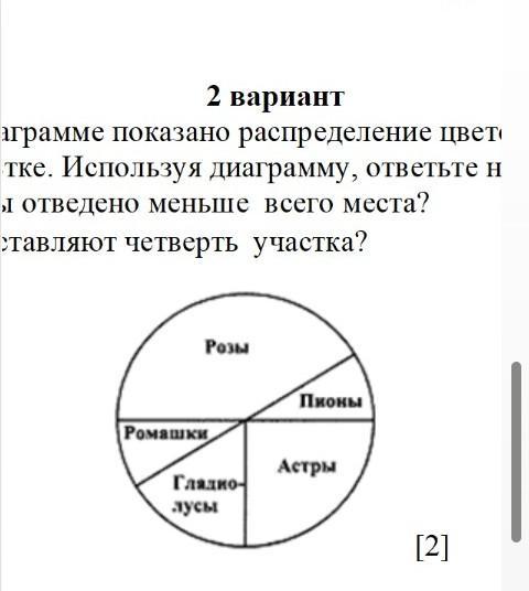 2. На круговой диаграмме показано распределение цветов, которые выращивают на садовом участке. Используя диаграмму, ответьте на вопросы.