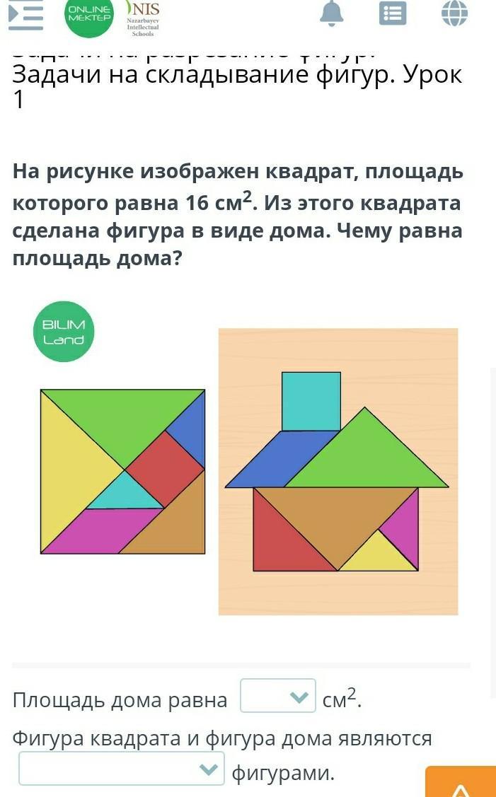 На рисунке изображен квадрат, площадь которого равна 16 см2. Из этого квадрата сделана фигура в виде дома. Чему равна площадь дома?