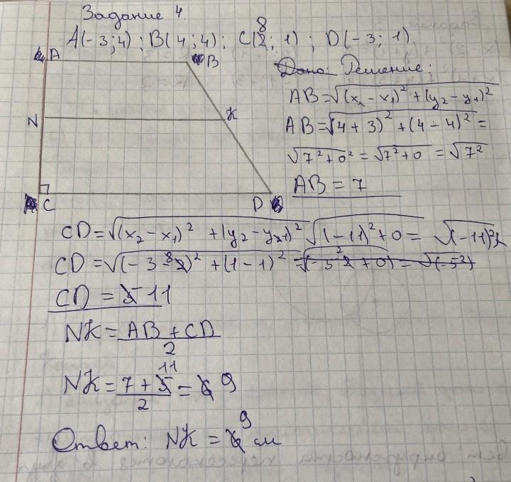 Точки A(-12;7), B(-3;4), C(7;6), D(-8;-3) - вершины прямоугольной трапеции с основаниями AB и CD. Найдите длину средней линии и площадь трапеции