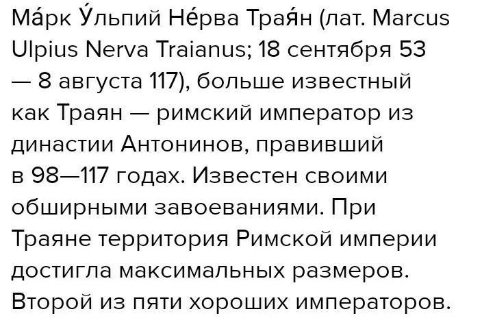 Ма́рк У́льпий Не́рва Трая́н (лат. Marcus Ulpius Nerva Traianus; 18 сентября 53 — 8 августа 117), больше известный как Траян — римский император из династии Антонинов, правивший в 98—117 годах. Известен своими обширными завоеваниями. При Траяне территория Римской империи достигла максимальных размеров. Второй из пяти хороших императоров.