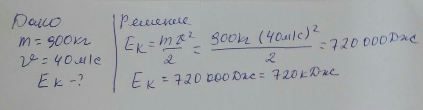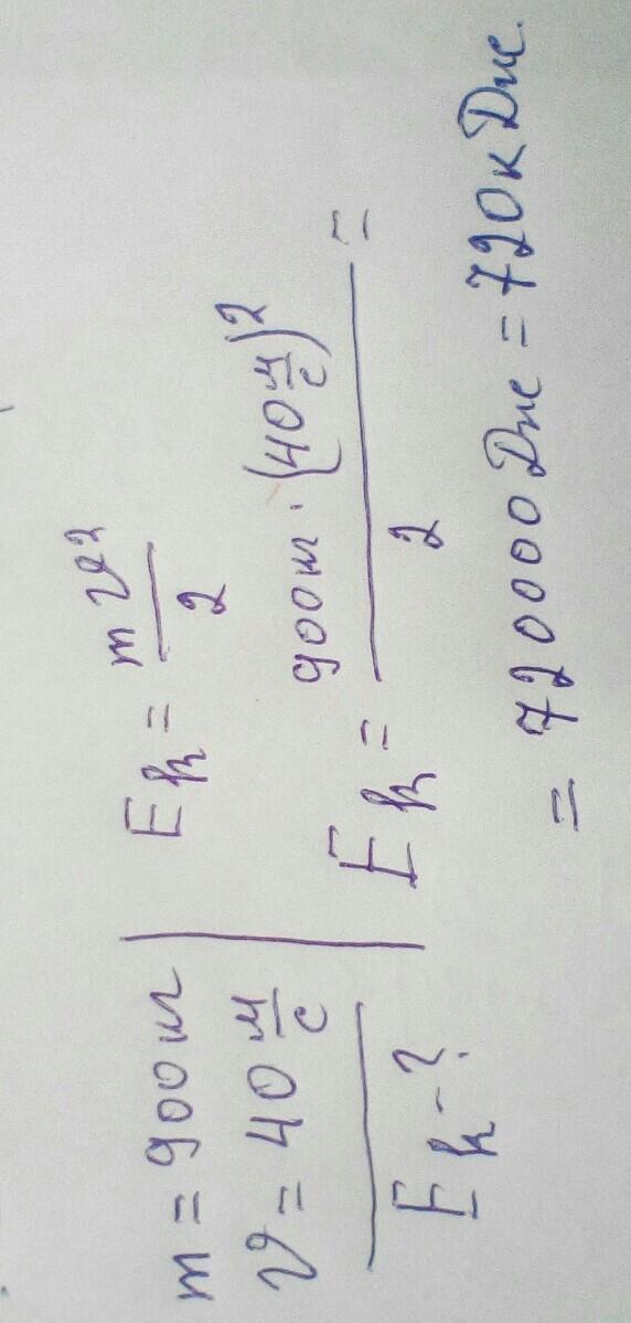 Найти кинетическую энергию автомобиля массой 900 кг, движущегося со скоростью 40 м / с.