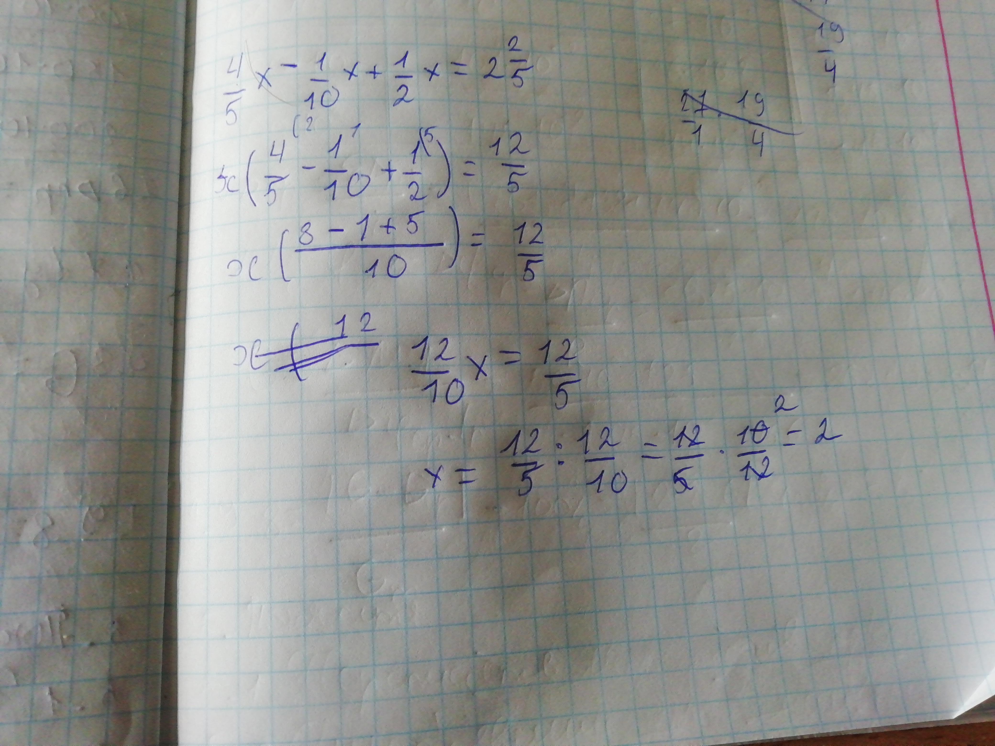 Розв’яжи рівняння 4/5x-1/10x+1/2x=2 2/5