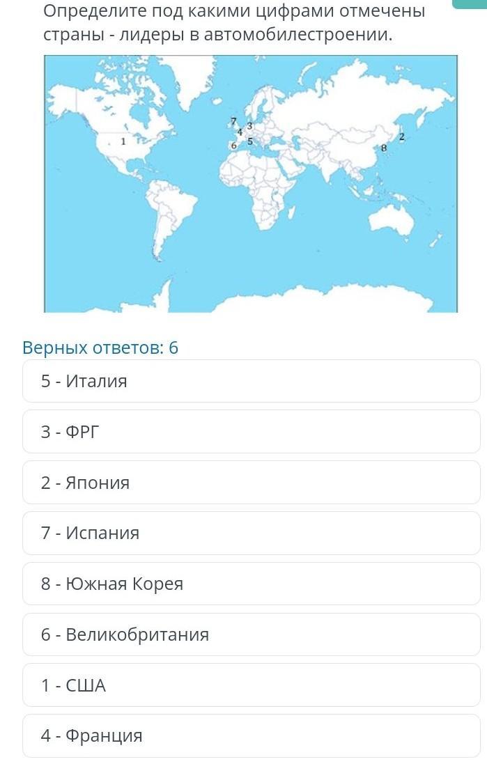 в мировом автомобилестроении сформировались три главных ареала азиатский со ведущей ролью в Японии американский с доминированием США и Западной европейской с менее выраженными доминированием ФРГ лидерами являются США и Япония за лидерами следует ФРГ Франция Италия Испания Великобритания Южная Корея на контурной карте указаны цифрами страны Определите под какими цифрами отмечены страны лидеры в автомобилестроении