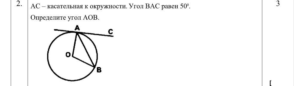 1)Радиус, проведённый в точку касания, перпендикулярен касательной, угол САО = 90° => угол ВАО = 90° - 50° = 40°