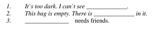 Task 2. Choose coгтect indefinite pronouns: somebody, anybody, nobody, everybody, everything. everywhere, something, anything, nothing It's too dark. I сап'1 see 2. 3. This bag is emру. There is in it. псeds friends. WRITING