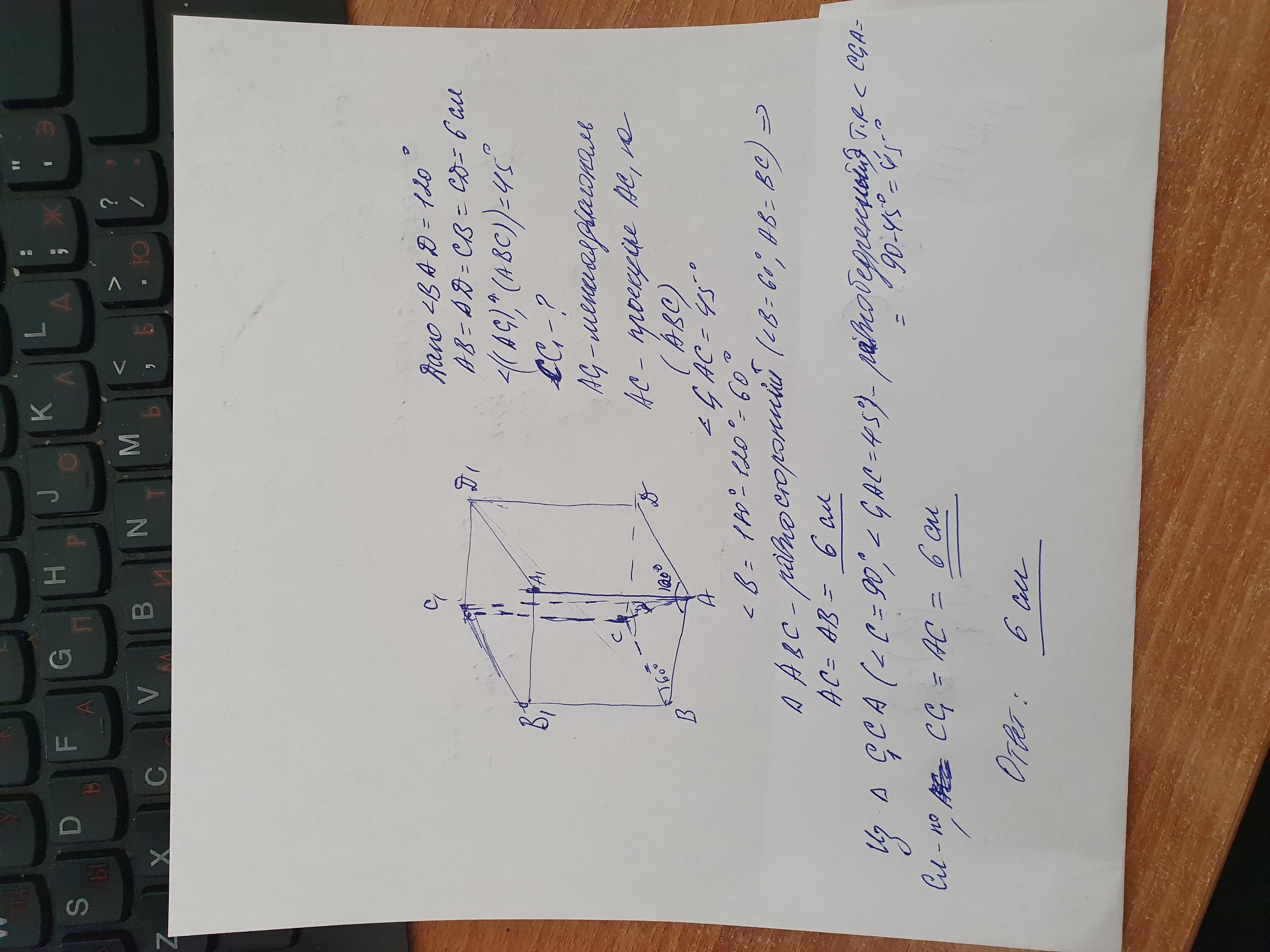 Основанием прямого параллелепипеда является ромб со стороной 6см и тупым углом 120°. Найдите боковое ребро параллелепипеда, если его меньшая диагональ составляет с плоскостью основания угол 45°