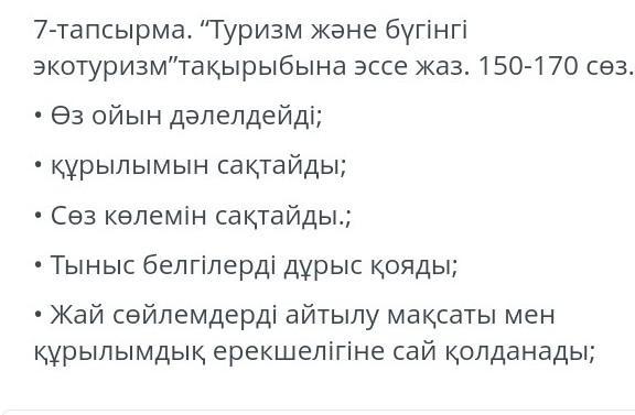 7-тапсырма. "Туризм жане бүгiнгi экотуризм такырыбына эссе жаз. 150-170 сез