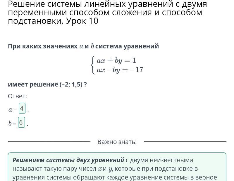 Решение системы линейных уравнений с двумя переменными способом сложения и способом подстановки. Урок 10 При каких значениях a и b система уравнений имеет решение (–2; 1,5) ? Ответ: a = . b = .