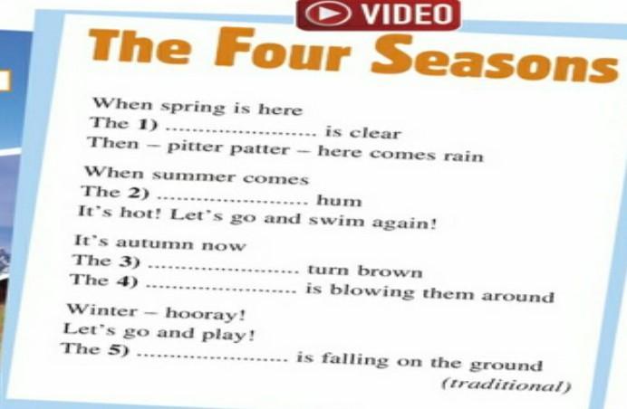 When spring is here is clear pitter patter – here comes rain The 1) Then When summer comes The 2) hum It's hot! Let's go and swim again! It's autumn now The 3) turn brown The 4) is blowing them around Winter - hooray! Let's go and play! The 5) is falling on the ground (traditional)