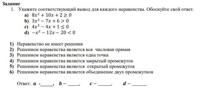 2 корня. Ветки параболы направлены вверх, у >= 0 на двух промежутках