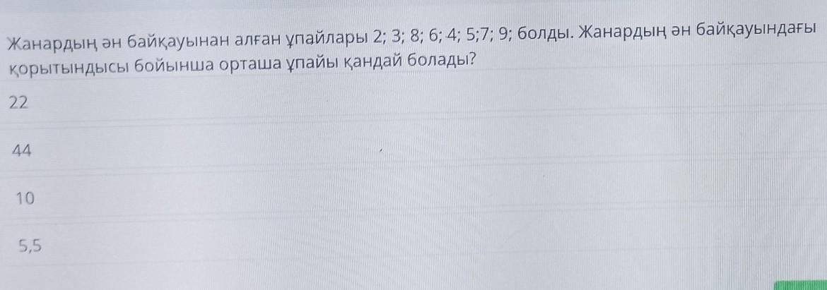Очки Жанар в песенном конкурсе 2; 3; 8; 6; 4; 5; 7; 9; было. Какой будет средний балл Жанар на песенном конкурсе?