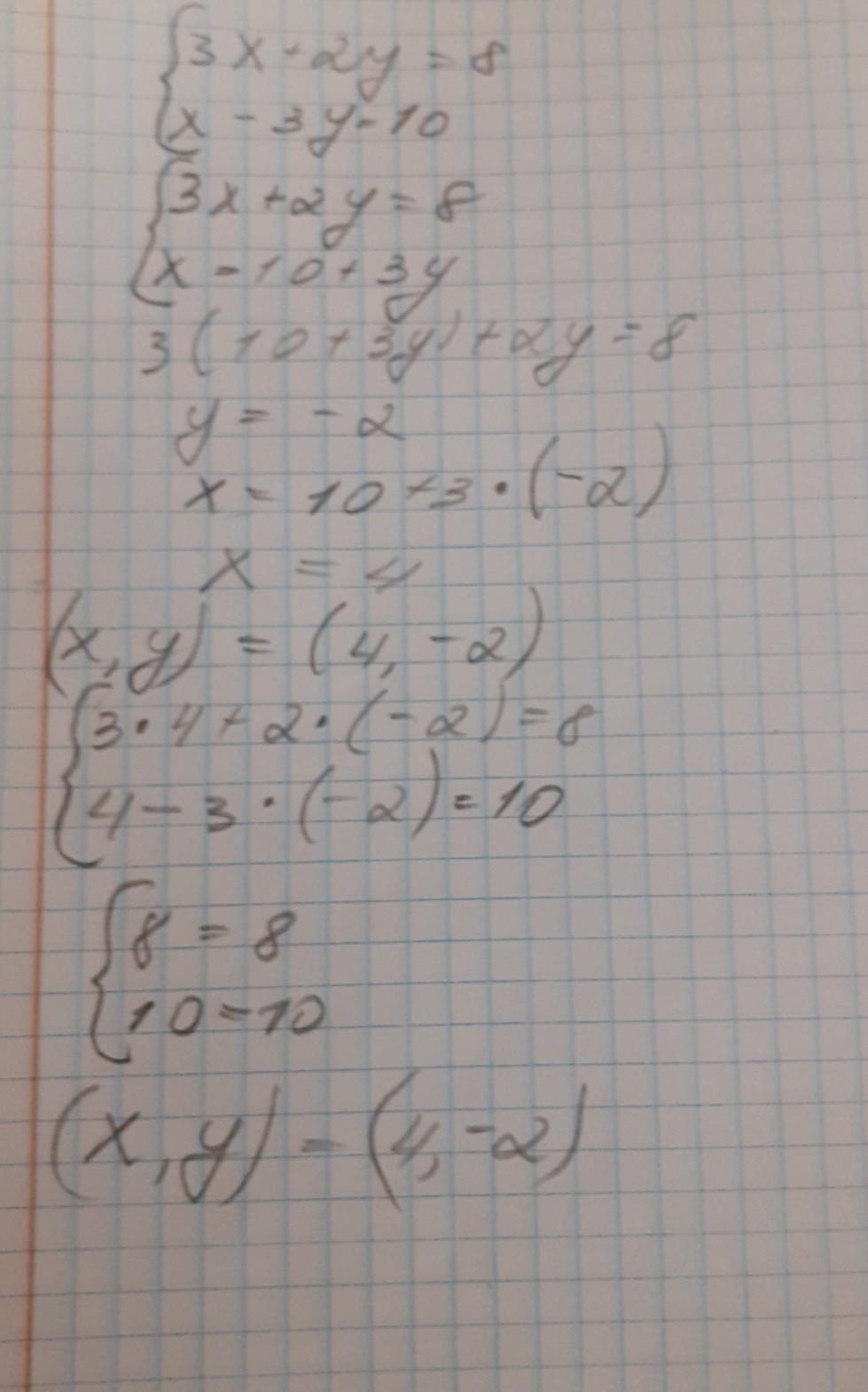 y = - 2 , тоді х = 3 * ( - 2 ) + 10 = 4 ; ( 4 ; - 2 ) - розв"язок .