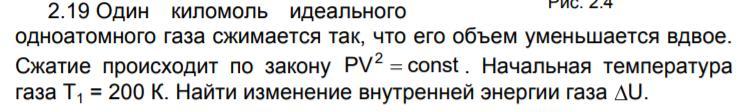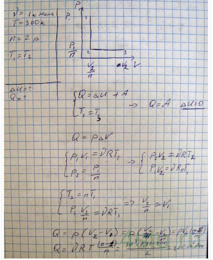 Один киломоль идеального газа, находящегося при температуре Т = 300 К, охлаждается изохорически, в результате чего давление уменьшается в n = 2 раза. Затем газ изобарически расширяется так, что в конечном состоянии его температура равна первоначальной. Изобразить процесс на Р-V диаграмме. Определить изменение внутренней энергии ΔU и количество тепла Q, подведенного к газу.