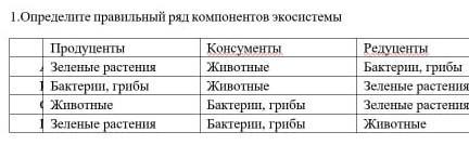 Определи правильный ряд компонентов экосистемы продуценты зелёные растения бактерии грибы животные зелёные растения концу менты животные животные бактерии грибы бактерии грибы редуценты бактерии грибы зелёные растения зелёные растения животные