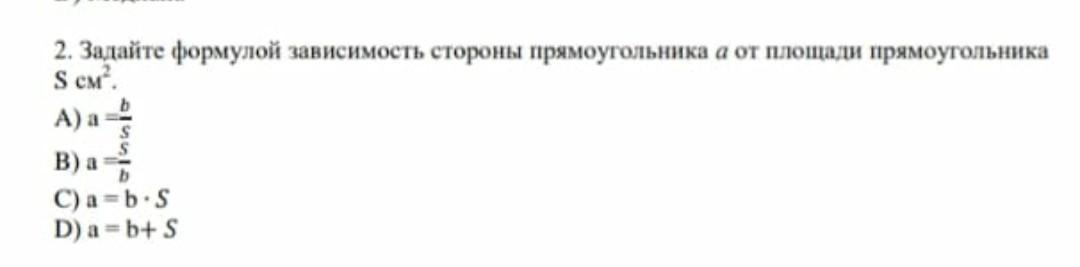 Задайте формулой зависимость стороны прямоугольника a от площади пряумогольника S см2. ПОМОГИТЕ ПОЖАЛУЙСТА!) Ответьтееее люди аа срочнооо