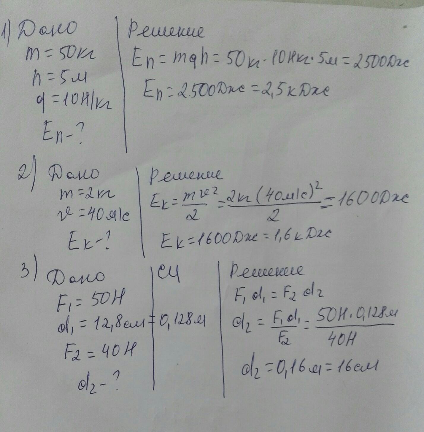 1. Какова потенциальная энергия ребенка весом 50 кг на рост 5 м? 2. Найдите кинетическую энергию объекта массой 2 кг, движущегося со скоростью 40 м / с.