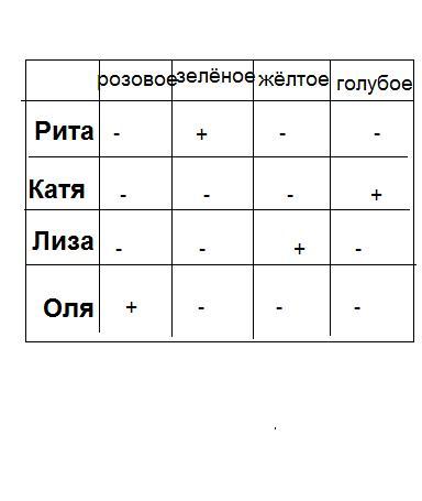 Получились три " минуса " в колонке с зелёным у Кати, у Оли, у Лизы, значит у Риты зелёное платье -ставим " плюс" в зеленом