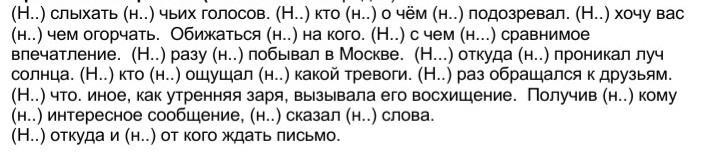 Не слыхать ничьих голосов. Никто ни о чём не подозревал. Не хочу вас ничем огорчать. Обижаться не на кого. Ни с чем не сравнимое впечатление. Ни разу не побывал в Москве. Ниоткуда не проникал луч солнца. Никто не ощущал никакой тревоги. Не раз обращался к друзьям. Не что иное, как утренняя заря, вызывала его восхищение. Получив никому не интересное сообщение, не сказал ни слова. Неоткуда и не от кого ждать письмо.