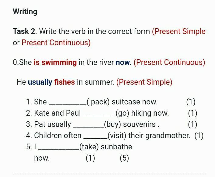 Тут легко, к тому же сверху объяснение. Видишь слово now (перевод: сейчас, в данный момент) - пишешь соответствующую форму Present Continious (добавляешь к глаголу окончание ing, а перед ним ставишь глагол to be в нужной форме). Видишь наречия частотности - слова, указывающие на то, что действие, о котором говорится в тексте совершается на постоянной основе (например often - часто, или usually - обычно), то ставим соотоветствующую форму Present Simple, там ничего не надо добавлять, просто глагол в инфинитиве.