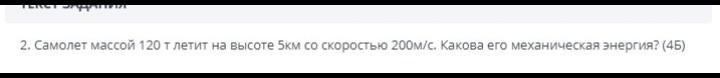 Самолет массой 120т летит на высоте 5км со скоростью 20м/с. Какова его механическая энергия?