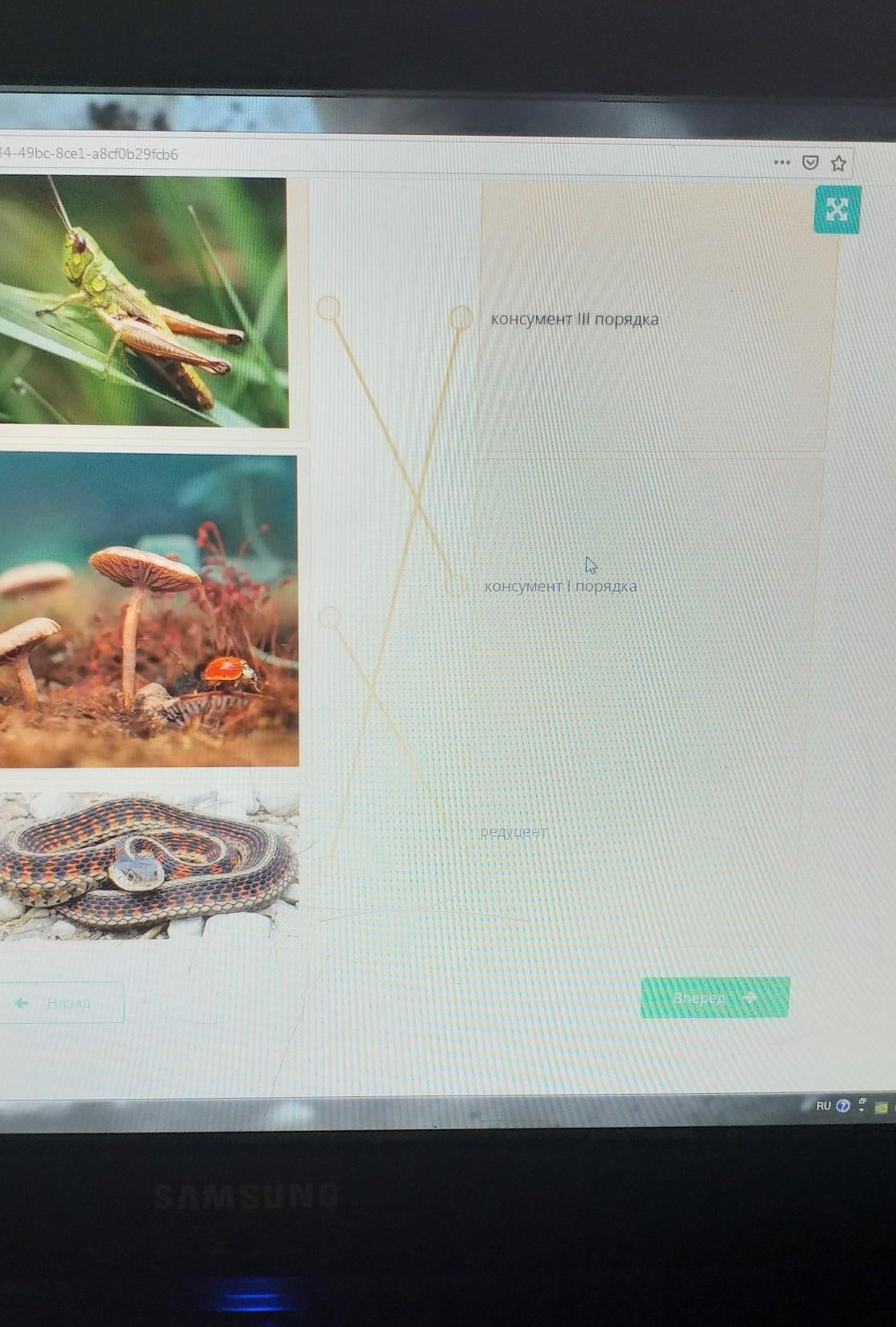 Определите компоненты экосистемы. Укажите живые организмы с их положением в пищевой цепочке.