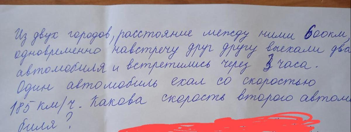 СРОЧНООО СПАСИТЕ, НАМ ДАЛИ ЗАДАНИЕ КОТОРОГО НЕТУ В КНИГЕ…:( Из двух городов расстояние между ними 600 км одновременно навстречу друг другу выехали два автомобиля и встретились через 3 часа один автомобиль ехал со скоростью 185 км/ч какова скорость второго автомобиля