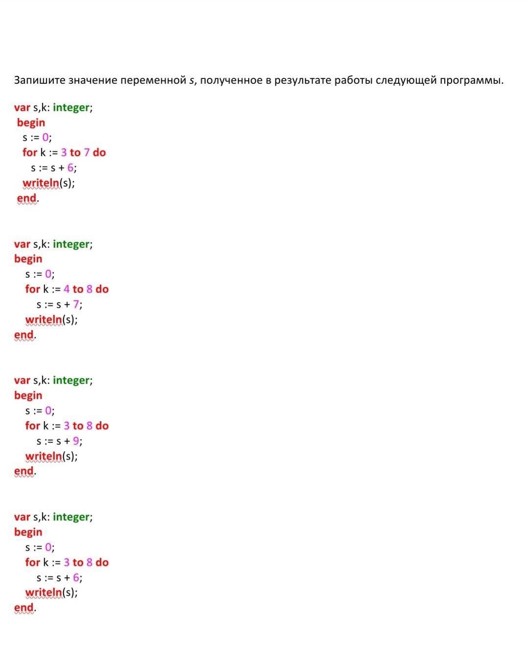 запишите значение переменной s прлученное в результате работы следующей работы