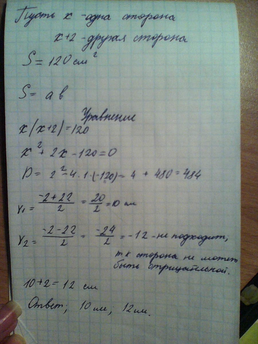 Одна из сторон прямоугольника на 2см больше другой. Найдите стороны прямоугольника, если его площадь равна 120см "в квадрате".