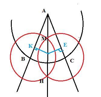 Далее, с постоянным раствором циркуля, с центрами в точках В и С построить окружности, пересекающиеся в двух точках ( у нас это точки М и Н. Если через них провести прямую АН, то она и будет биссектрисой.