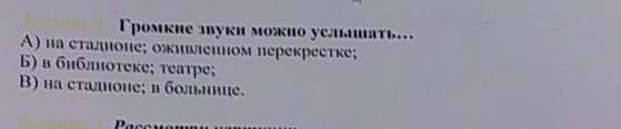громкие звуки можно услышать на стадионе оживленном перекрестке? библиотеки театре? на стадионе в больнице? помогите где именно я думаю что либо в А или В вопросе